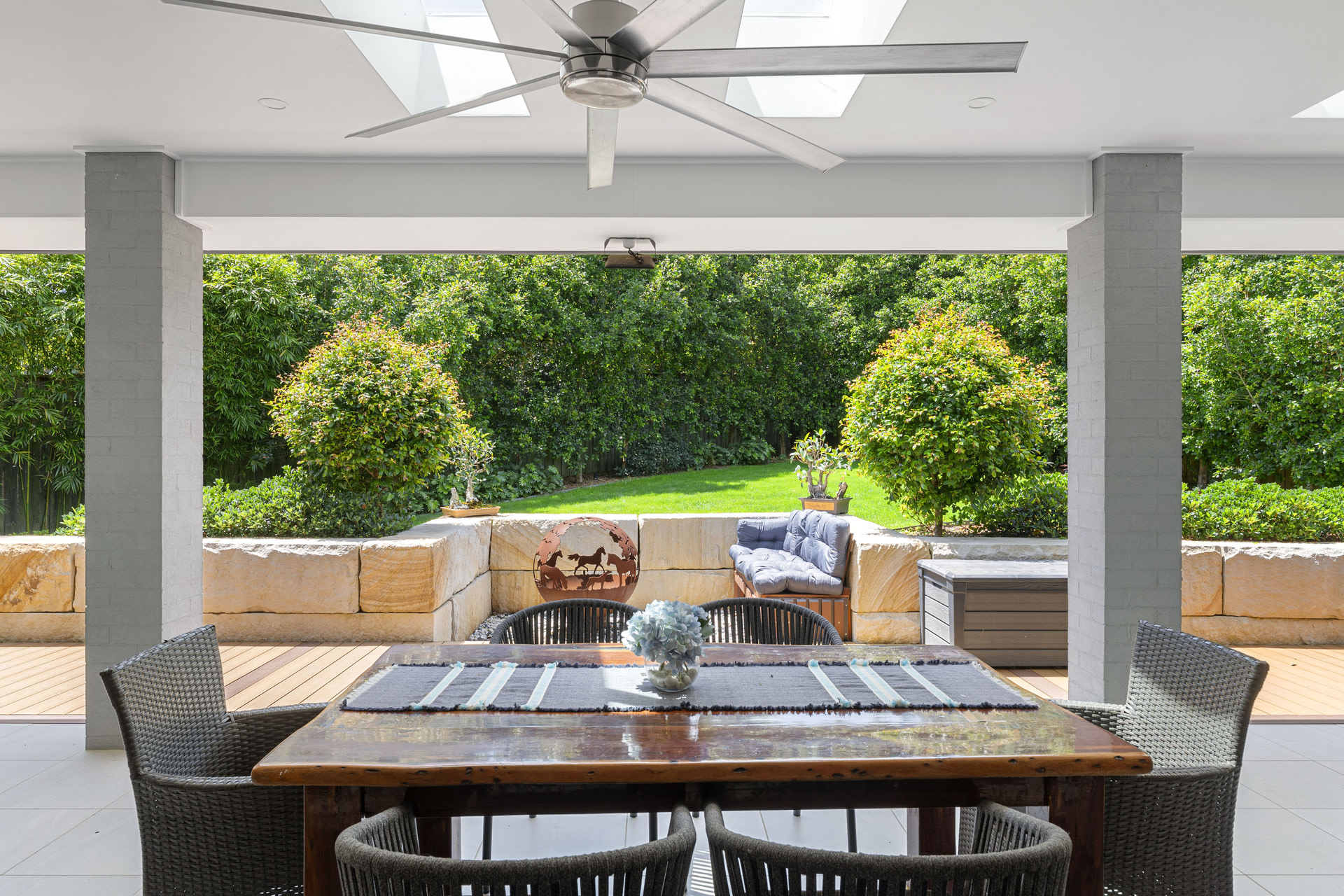 At the heart of the home, expansive open-plan living and dining spaces make entertaining a joy. These light-filled areas flow seamlessly to the fully landscaped grounds, creating an inviting atmosphere for gatherings and relaxation. Entertain family and friends on the covered alfresco patio with gas BBQ connection, overlooking the private lawned garden fringed with established hedges. Indulge in Summer fun in the pristine pool whilst enjoying an elevated outlook over this leafy suburb from the decked surrounds.